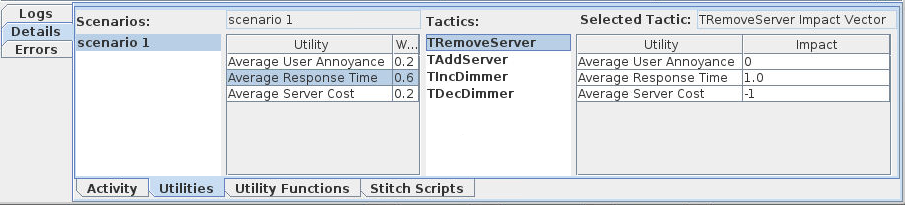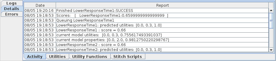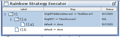 The adaptation manager chooses which strategy to execute in response to an error. The element in the Rainbow window lists the history of the strategies that have been chosen by Rainbow, what the final utility is predicted to be, and, once executed, whether the strategy was successful or not.