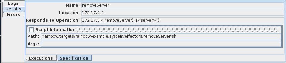 Effectors perform actions on the system in response to operations published by executors. The entry on the Rainbow window for an effector is a table of the number of times it has been executed, the parameters passed to it, and whether it completed successfully or not.