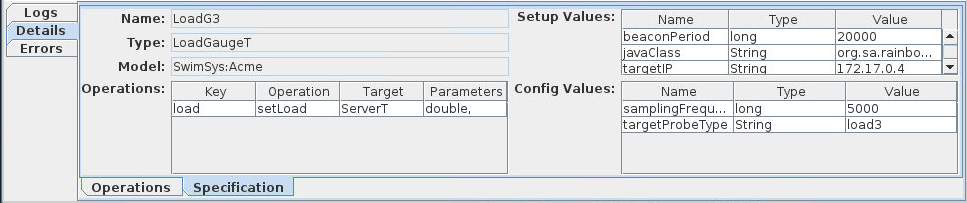 - Specification, which displays how the gauge was specified, including the operations it is allowed to emit, the Java class implementing the gauge, how it was configured, and how it was set up.