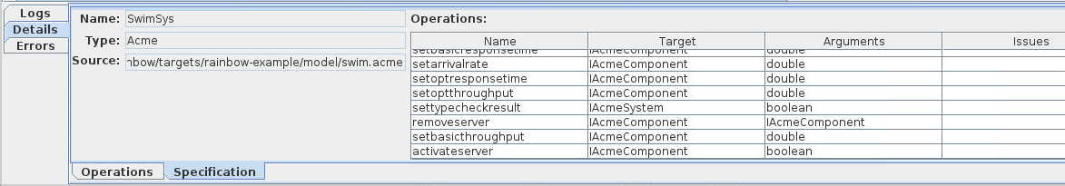 The Specification tab shows the source for the model, as well as the valid operations on that model.